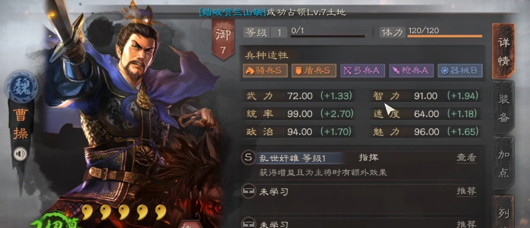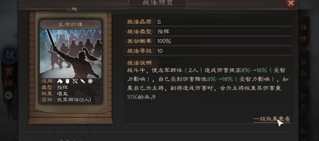 曹操作为魏国核心武将,其宝物搭配直接影响队伍强度。曹操的定位主要是辅助型武将,通过自带战法乱世奸雄为队友提供伤害加成和自身减伤效果,同时作为主将时还能获得生命恢复。这种特性决定了曹操在宝物选择上需要兼顾防御和辅助功能。