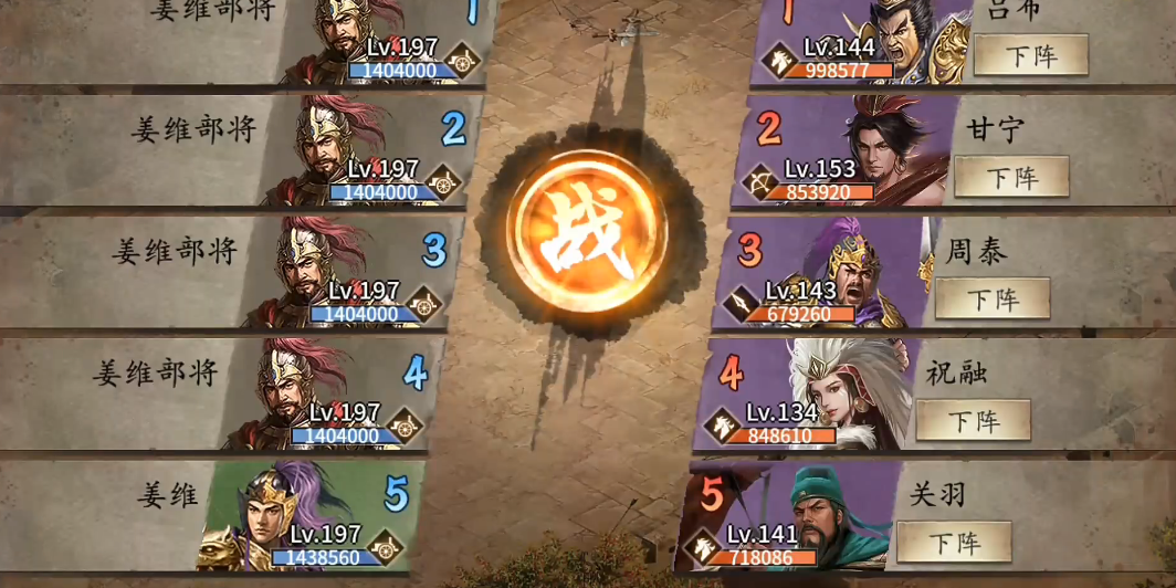 打这个本咱们需要一车夏侯带副将穿灵龟套,凤凰甘宁配司马懿,霸下周泰不带副将,驱虎貂蝉和灵龟关羽带曹仁。夏侯必须打死两个敌将,装备优先选红甲、黄杯这些防血御宝,甘宁要保证能放5-6次战法,周泰负责平砍叠状态,关羽最后收尾。