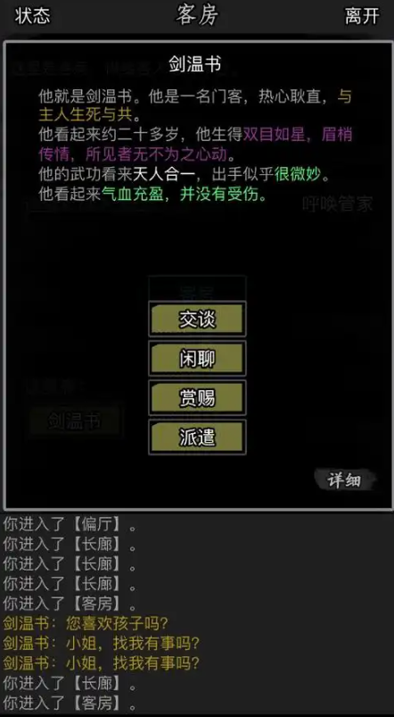 门客分为普通门客和沧浪贴门客两种类型,前者可以在固定章节中找到,后者则需要使用充值积分在苏州城书场沧浪居士处招募。普通门客如允慕雁出现在梅庄,邱丹山出现在绝情谷,别林出现在扬州城镇地图,华一瑾则出现在长安城镇地图。招募门客时需要达到一定的人物等级和江湖威望,不同门客对侠义值也有不同要求,建议保持侠义值处于中等水平,这样无论门客要求正负侠义值都能满足条件。门客上限取决于客房数量,普通豪宅最多4个客房,高门大户则可达6个。