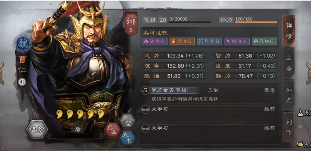 曹仁的兵种培养方向应优先提升盾兵适性等级,其次是枪兵。盾兵科技树中的防御加成与曹仁战法形成完美互补,而枪兵作为次选能在特定地图或对抗骑兵时发挥作用。需骑兵虽然也是A级适性,但与曹仁的防御定位存在一定冲突,除非特殊阵容需求,否则不建议重点培养。兵种战法的选择上,藤甲兵、陷阵营等防御型战法能与曹仁形成良好配合。
