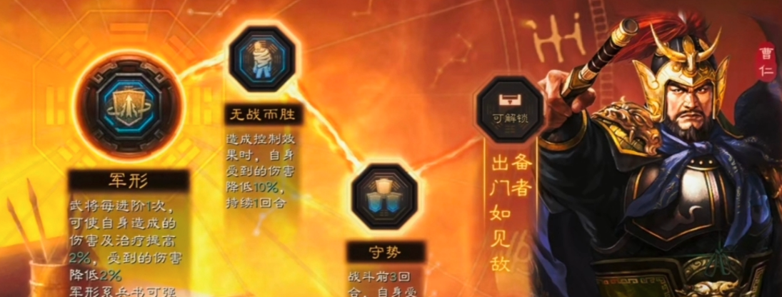 作为防御型武将,曹仁的兵种选择必须围绕其战法特性展开。固若金汤战法赋予其洞察状态和全体嘲讽能力,配合统率提升效果,使盾兵形态下的曹仁能有效吸收大量伤害。骑兵形态虽然移动速度更快,但会削弱防御能力;枪兵形态则更适合特定阵容搭配,需要根据战场环境灵活调整。在实际应用中,盾兵曹仁能稳定保护后排输出,为团队创造安全的输出环境。