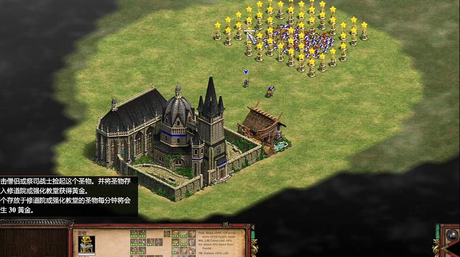 争夺圣物的最佳时机是城堡时代初期,玩家已具备生产僧侣的能力,且地图探索基本完成。建议优先升级神权和救赎科技以增强僧侣的生存能力和转化效率,同时派遣轻骑兵或步兵保护僧侣免受敌方骚扰。若在圣物胜利模式下,收集全部圣物并保持一定时间可直接获胜,因此圣物的战略价值远超经济收益。