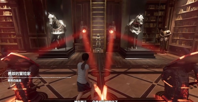 爬上二楼后,转动平台上的转盘,使蝙蝠翅膀完全展开,光线会投射到下方区域。需要返回一楼,将两个带有盾牌的士兵雕像移动到光束照射的位置。光束会反射并照射到特定区域,白皇后雕像会出现在栅栏后方,这是解谜的第二个关键点。