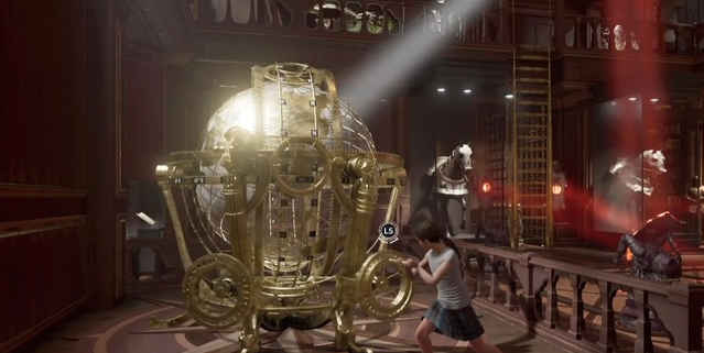 再次返回天球仪处,随意转动一下使其位置发生变化,栅栏会随之收起,白皇后雕像可以被移动。将白皇后移动到两束光线对齐的位置,背景音乐会发生变化,大门随之开启。这一步骤需要玩家注意光线的对齐情况,确保白皇后处于正确位置才能触发最终机关。