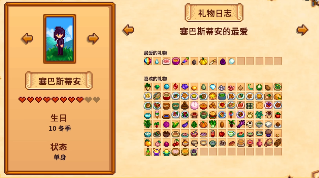 速提升和塞巴斯蒂安的好感度生鱼片是他的最爱!这个食谱需要先讨好流浪汉莱纳斯,用椰子刷满莱纳斯的好感后,他会写信教你制作方法。任意鱼类都能做成生鱼片,性价比超高。每周记得送两次礼物,冬季10号他的生日千万别错过,这可是好感度暴涨的机会。八颗心后送花表白,再用美人鱼吊坠求婚就能把他娶回家啦。