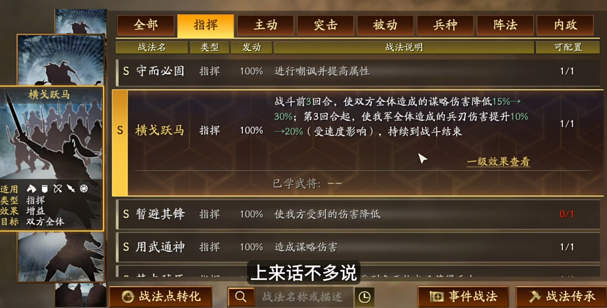 横戈跃马是三国志战略版中一种具有战术价值的指挥战法,其核心效果为战斗前三回合降低双方全体谋略伤害,同时提升普通攻击及突击战法伤害。该战法适合搭配高速高机动性武将,如马超、赵云等,能有效针对前期谋略爆发阵容,但面对全局爆发或纯物理输出队伍时需谨慎使用。