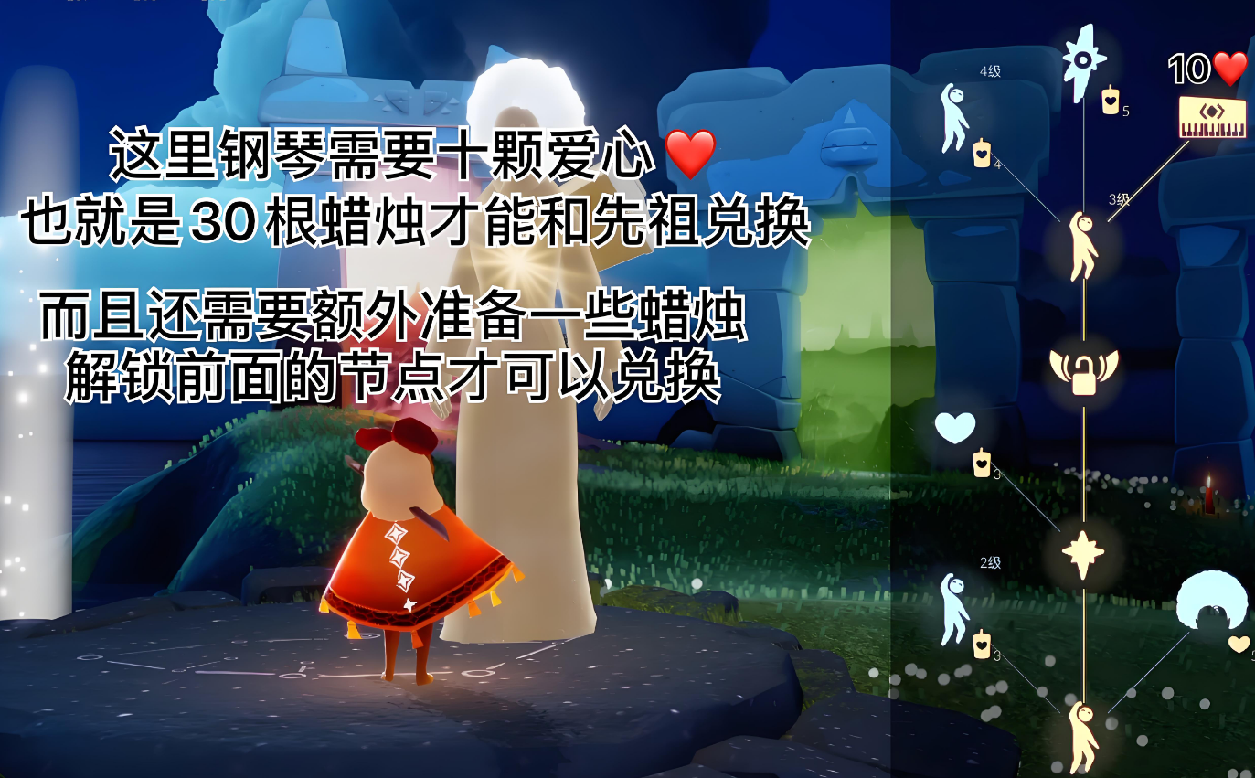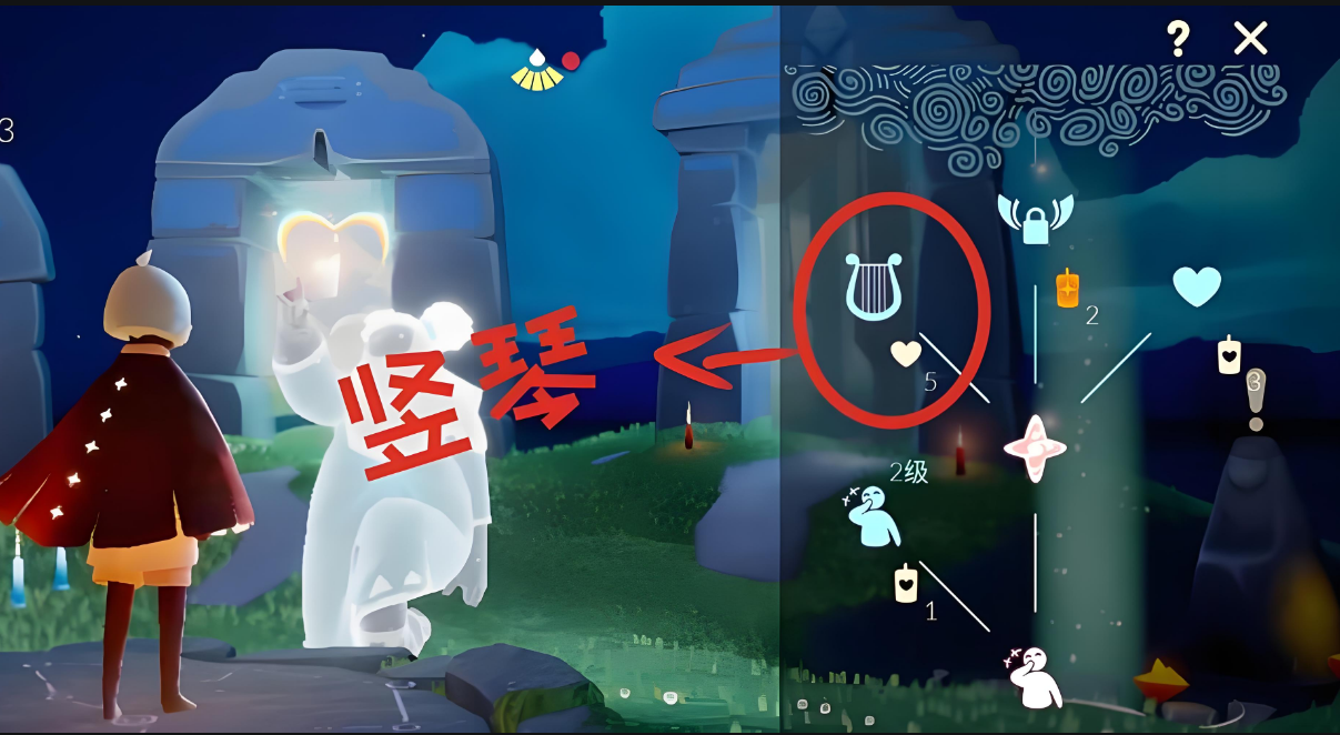 乐器需要通过先祖兑换获得,不同的乐器分布在云野、霞谷、墓土等地图中,兑换所需的爱心数量也不同。最基础的竖琴只需要5颗爱心,而电子琴则需要10颗爱心,记得多攒点爱心再去兑换哦。云野的偷笑先祖可以兑换竖琴,这位先祖藏在钟塔图的蝴蝶洞里,找到后记得送他回归天际,就能用5颗爱心换到竖琴啦。