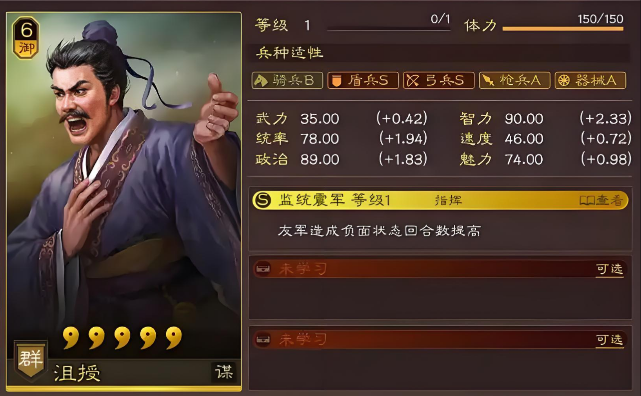 比如沮授的盾弓双S适应性让他在盾兵和弓兵阵容中都能发挥稳定作用,而他的速度属性决定了是否需要加速装备或加点来抢先手。控制武将通常需要一定的生存能力,比如曹仁的嘲讽战法就依赖高统率来扛伤害,而郭嘉这类辅助控制则需要速度属性来确保先手控场。加点方面,控制武将一般优先速度,其次是防御属性,确保能在对手行动前打出控制效果。