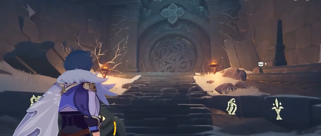 密室大门前的机关被冰块覆盖,需要用火元素攻击融化冰块才能启动。机关激活后会开启风场,附近还有三个小方块机关需要靠近激活。全部激活后,大门封印解除,这时候就能顺利进入密室了。密室里有四个火盆,全部点燃后可以直接获得武器雪葬的星银和它的锻造图纸。