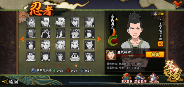 奈良鹿丸是C忍中的智将型代表,技能兼具消耗和控制能力。他的影子操控术距离远,适合远程磨血和蹭奥义点,爆式翔刀能后撤拉开距离并造成伤害,大招判定范围大且容易命中。鹿丸操作门槛低,适合新手熟悉游戏机制,但上限很高,熟练后甚至能压制部分B忍和A忍。