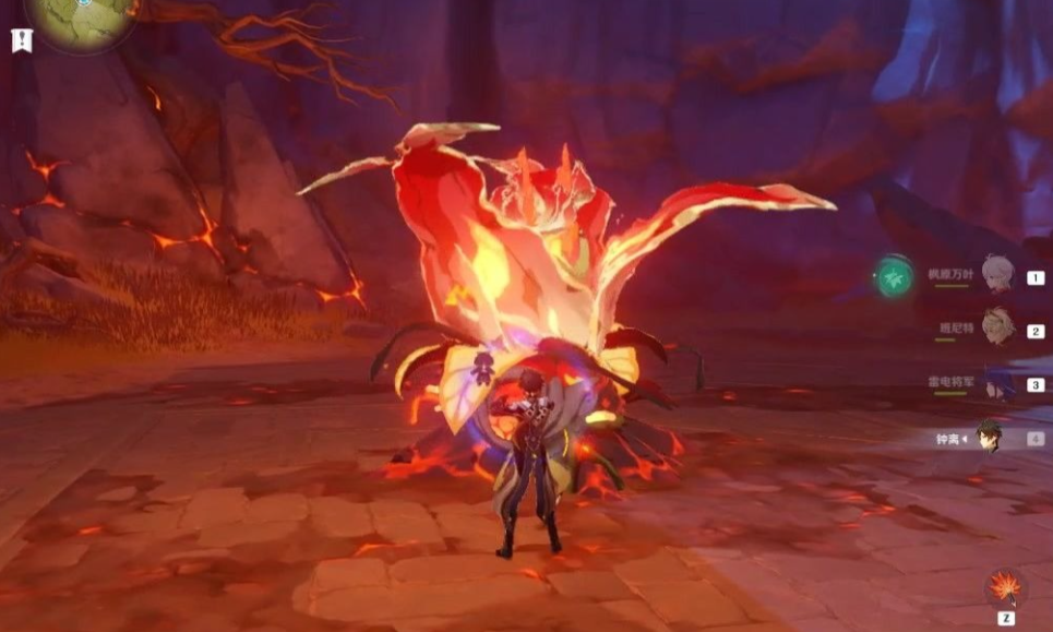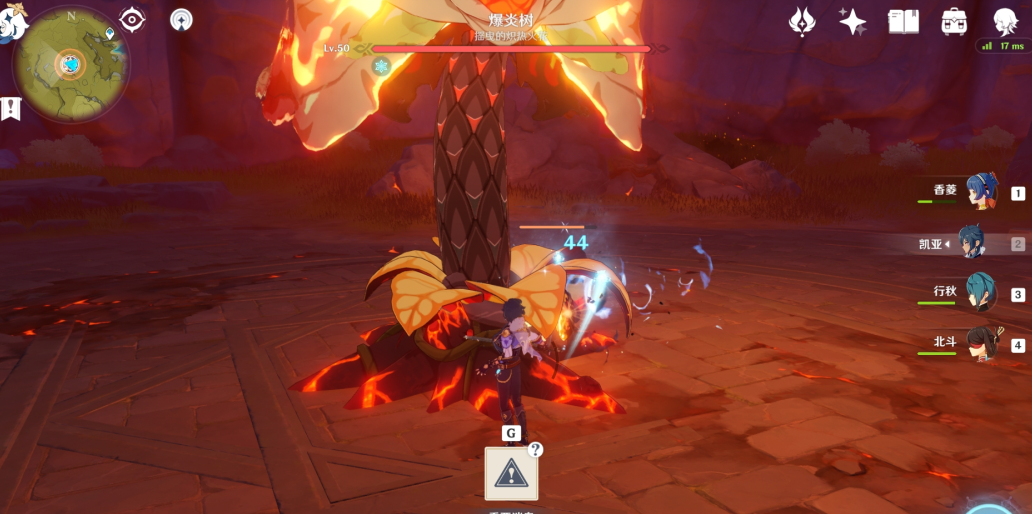 打爆炎树的位置在渌华池西侧山洞里,从东北方传送点过去最近。开战前记得喝耐热药剂减少火伤,备点恢复体力的食物方便闪避。开局弱点在根部,用水元素角色平A或技能快速击破;瘫痪结束后弱点会转移到花冠,这时候用远程角色攻击头部。如果没及时打掉花冠弱点,它会重新变回根部弱点,所以输出要抓紧时间。