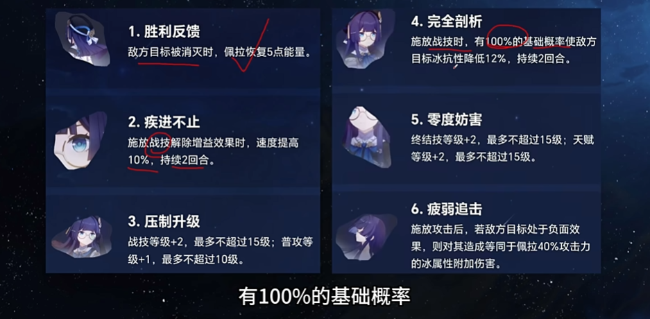 1魂能在击败敌人时回复能量,提升终结技循环效率,适合多怪环境。4魂是核心质变魂,释放终结技时能让敌人受到的韧性伤害提高50%,还能额外附加负面效果,不仅增强全队破盾能力,还能完美适配她的专属光锥。6魂则让佩拉在攻击带负面效果的敌人时触发额外冰伤,大幅提升她的副C输出能力。这几个星魂的叠加效果让佩拉从功能辅助晋升为全能型角色。