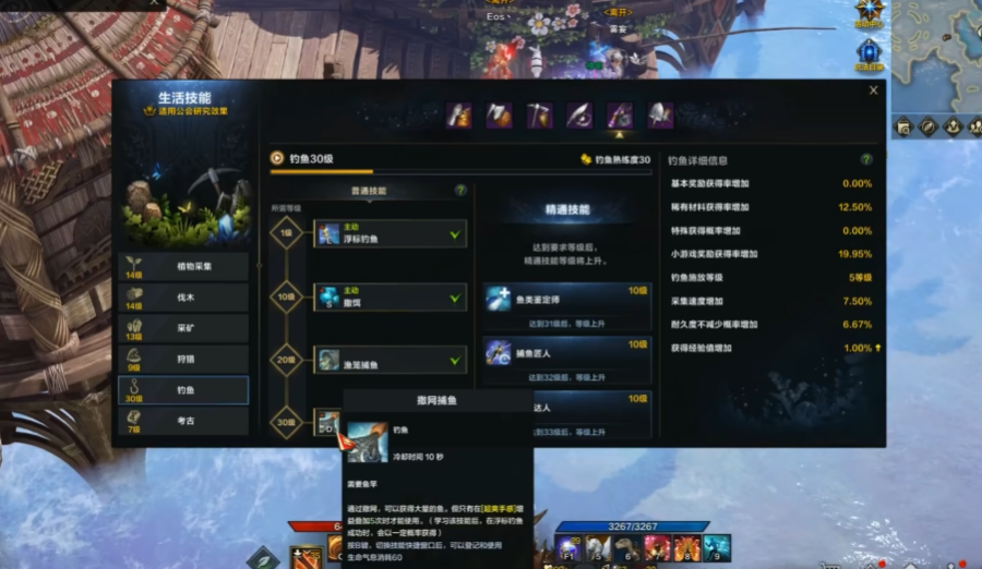 按K键打开技能面板,可以给钓鱼加点,等级越高越容易钓到稀有鱼类。钓到的鱼不仅能卖钱,还能制作高级鱼饵或者完成岛屿任务。有些特殊岛屿的钓鱼点还会触发隐藏事件,比如召唤BOSS或者解锁成就,所以多探索地图绝对没坏处。