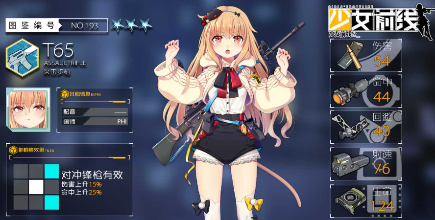 从养成成本来看,t65作为三星人形,扩编压力相对较小,前期很容易凑齐复制体完成扩编。她的获取方式也比较简单,可以通过常规建造或部分关卡掉落,对新手指挥官比较友好。不过她的光环效果比较普通,只能为后排提供命中加成,在队伍搭配上局限性较大。如果指挥官已经拥有像M14这样的低星战神,或者抽到了更高星级的步枪,t65的优先级就会降低不少。
