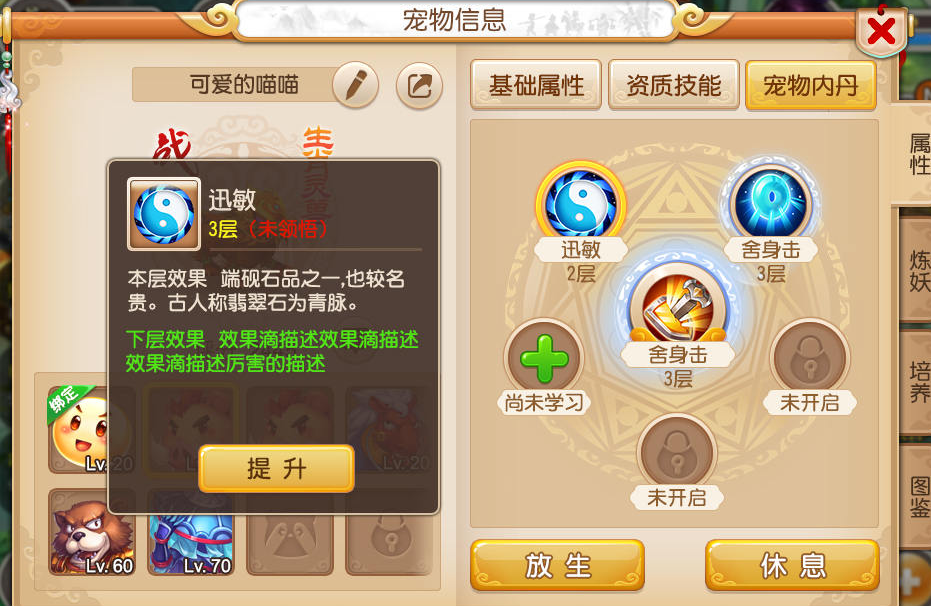 给攻宠搭配内丹时,优先考虑提升物理伤害和暴击效果的核心组合。迅敏和奇袭是必带的基础内丹,迅敏直接增加面板伤害和速度,奇袭则提升伤害结果,两者都能稳定增强输出能力。狂怒适合搭配高级必杀技能,暴击时能额外造成可观伤害;阴伤则与连击技能联动,弥补连击带来的伤害衰减。如果追求爆发,生死决是不错的高级内丹选择,虽然会降低防御,但对隐身宠影响较小。