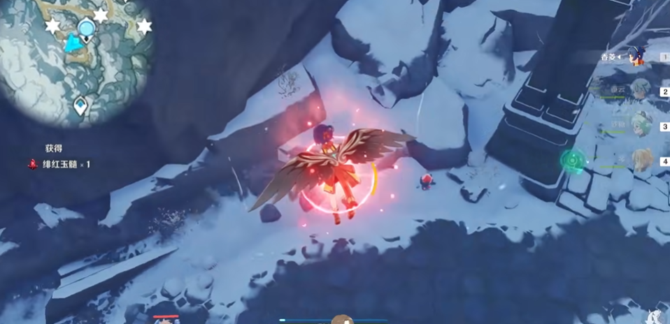 部分高空绯红玉髓被坚冰覆盖,需要使用深赤之石破除。深赤之石通常分布在绯红玉髓附近的山体或平台上,击碎后需在限定时间内攻击坚冰。对于位置特别高的绯红玉髓,可采用从更高处滑翔的方式接近,或利用岩属性角色的创造物作为中途落脚点。在寒天之钉区域的高空绯红玉髓,需要完成山中之物任务解除屏障后才能获取。