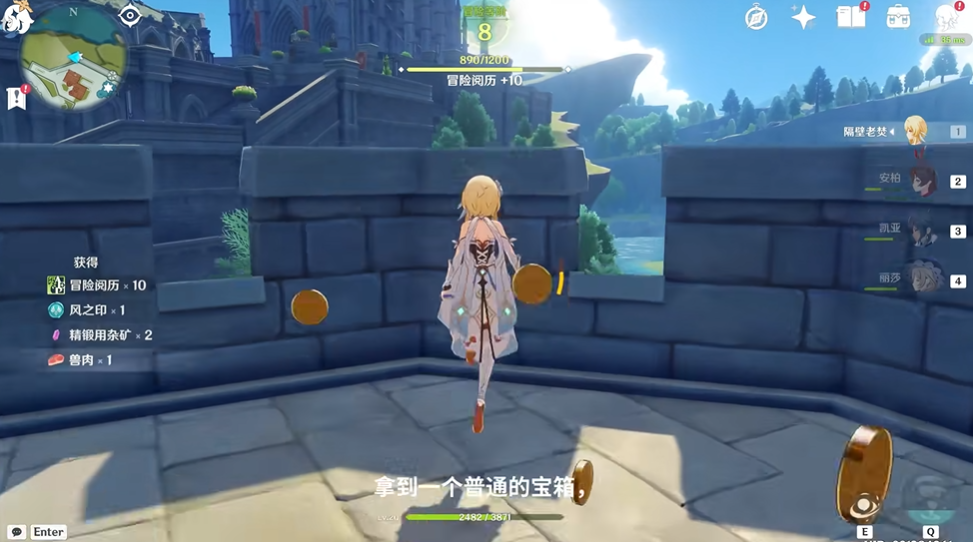 探索时记得打开元素视野,某些宝箱藏在落叶堆或碎石后,用风元素吹散落叶或击碎岩石才能显现。城门桥头树下就有一个需要风元素触发的隐藏点,但若之前开过可能不会重复刷新。广场石台上有发光光圈,沿着围栏跟随光圈走完全程能解锁华丽宝箱,手机玩家操作时要小心别掉下去。