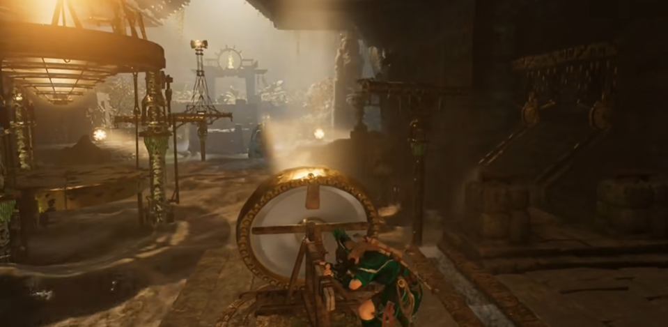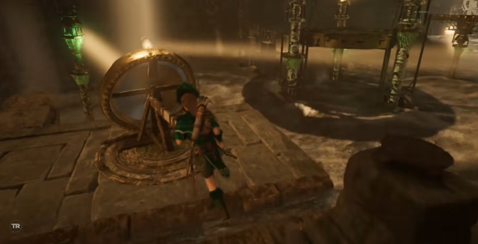 古墓中央区域有一个需要摆荡巨大空间,这里的关键是掌握好跳跃时机。先利用钩斧固定到对面平台,中间会有悬吊物垮塌的陷阱,快速连续摆荡避免坠落。到达对面后别急着前进,左侧岩壁下有一个隐藏洞穴,里面是太阳神庙古墓挑战的入口。完成挑战后能获得曼科的靴子,提升移动能力。