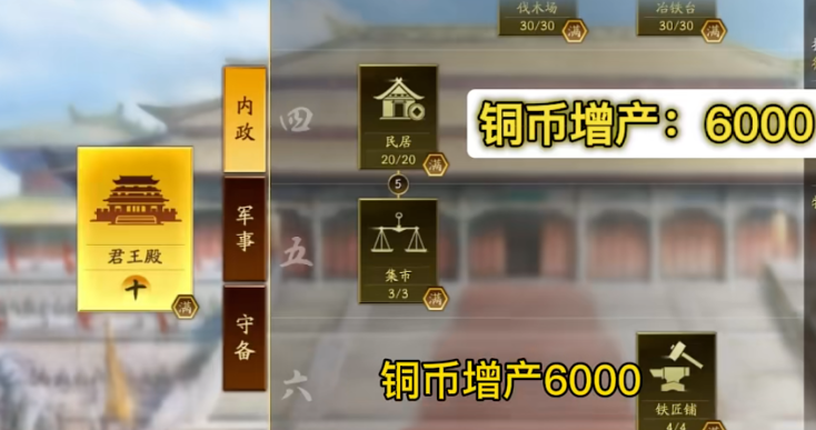 到了中期,铜钱的重点要转向兵书系统。兵书能大幅提升队伍战斗力,但开启和升级都需要大量铜钱,建议优先点满主力队的兵书。如果铜钱紧张,可以适当减少良将招募次数,或者通过屯田、征收赋税、击杀蛮族等方式多攒点。铜钱产量和民居等级挂钩,所以主城建设时别忘了升级民居,长期收益比临时抱佛脚强多了。