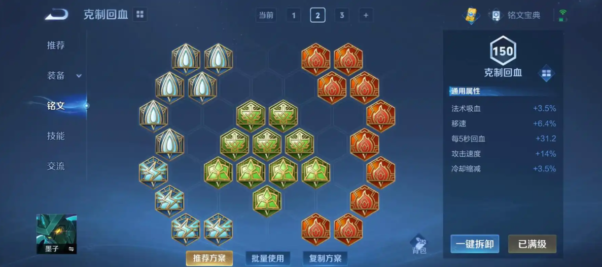 铭文这块儿,墨子一般带10梦魇、10心眼和10狩猎,这一套下来给墨子加了不少法术攻击、穿透和移动速度,让他前期对线时清兵和骚扰都更顺手,支援队友也跑得更快。梦魇主攻法强和穿透,心眼再补点穿透和攻速,狩猎则让移速和攻速都上去了,打起来手感更流畅。有些玩家也会选调和来加点生命和续航,但多数情况下狩猎的移速加成对墨子这种需要频繁游走的英雄很实用。这些属性搭配起来,能让墨子在对线和团战中都发挥出稳定的威力。