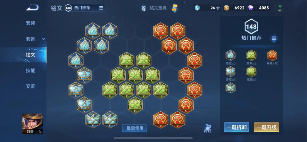 说完出装,咱们还得提一嘴和出装紧密相关的铭文搭配,因为它直接影响了刘备前期的刷野效率、续航和打架能力。现在主流的铭文搭配思路是平衡物理穿透、攻击速度、物理吸血和一点点暴击。红色铭文通常带异变或者混搭红月、祸源,用来加物理穿透和攻击速度或者暴击率。绿色铭文基本固定是十个鹰眼,提供最重要的物理穿透和物理攻击。蓝色铭文的选择比较多变,可以带夺萃来增强前期的吸血续航,不用那么早出泣血之刃;也可以带狩猎来提升移速和攻速,让走位和刷野更流畅;或者两者混搭,比如五个夺萃加五个狩猎,既能吸血又能跑得快。一套好的铭文,能让刘备在没出大件装备的前期就拥有不错的战斗力,是打出优势的基础。