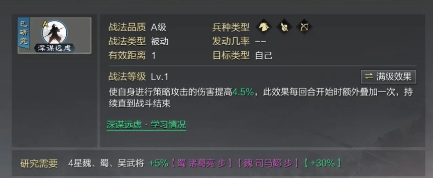 张角的核心组合是不攻和深谋远虑,这两个战法能极大地提升他的输出稳定性。不攻能防止张角因为攻击成长低而毫无作为,提供每回合的稳定增益,而深谋远虑则能让张角的伤害每回合持续增强,并且刷新妖术诅咒的持续时间,避免伤害中断,其他可选战法包括楚歌四起或十面埋伏,这些都能与张角的持续伤害特点完美契合,让他在战斗中越打越强。