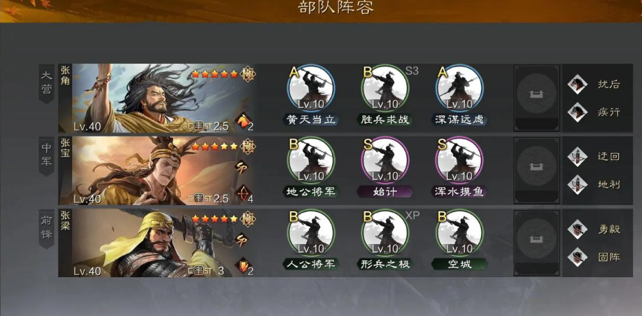 队伍搭配上,张角通常作为大营输出核心,常见的强力组合是网红队,包括张角、张机和弓诸葛亮,这个阵容的优势在于拥有高额伤害和稳定控制,适合大多数玩家快速成型。另一个流行搭配是角法关队,由张角、法正和关羽组成,强调快速爆发和输出能力,对于没有张机的玩家,可以尝试用张角、貂蝉和严颜组成形兵队,通过形兵之极提高张角的战法发动几率,增强整体战斗力。