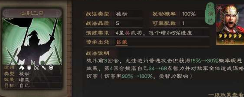 司马懿自身的战法搭配相对固定,通常最优选择是士别三日和用武通神。士别三日在前三回合提供规避效果并增加智力,第四回合还能打出一次不错的谋略伤害,完美契合司马懿前期生存、后期爆发的需求。用武通神则是指挥战法,从第二回合开始每偶数回合对敌军造成稳定且递增的伤害,是司马懿后期输出的核心保障。如果暂时没有用武通神,也可以用四面楚歌、熯天炽地这类高伤害主动战法作为替代,只是稳定性会稍差一些。