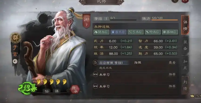 加点的话,张角和左慈一般都是全加智力,保证输出和治疗量。于吉如果带了藤甲兵这种防御战法,可以多加一些统率,让自己和队伍的前排更硬实。兵书选择上,张角可以用疾战突围、鬼谋、将威来强化输出;左慈常用援其必攻、散仙、掩虚来提升治疗量和自保;于吉则可以选择一些防御向的兵书。装备的话,因为这三位都是仙人,有额外的属性加成,所以给他们穿好一些的智力或防御装备就很有用,特别是要注意队伍的速度顺序,一般建议左慈的速度最快,这样才能在被控时及时用刮骨疗毒帮队友解围。