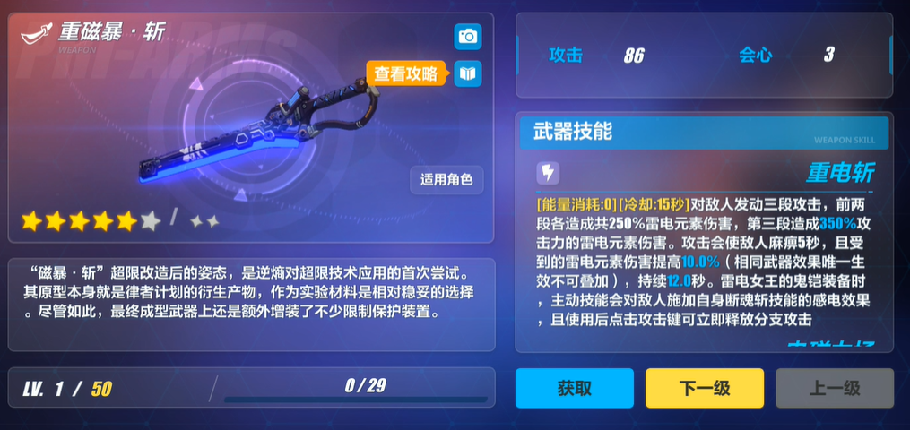 这把武器的技能效果非常围绕雷电元素伤害来设计。它的主动技能叫重电斩,不用消耗能量,冷却时间15秒,能对敌人发动三段雷电攻击,前两段各有伤害,第三段那一下特别疼。最关键是,打了之后能让敌人麻痹一阵子,并且在一段时间内让敌人吃到的雷电元素伤害变多,等于给敌人上了个易伤的debuff。如果你是用特定的女武神雷电女王的鬼铠来拿这把刀,效果就更厉害了,放主动技能时还能直接给敌人挂上感电状态,并且用完技能后立马按攻击键就能打出分支攻击,连招特别顺滑。
