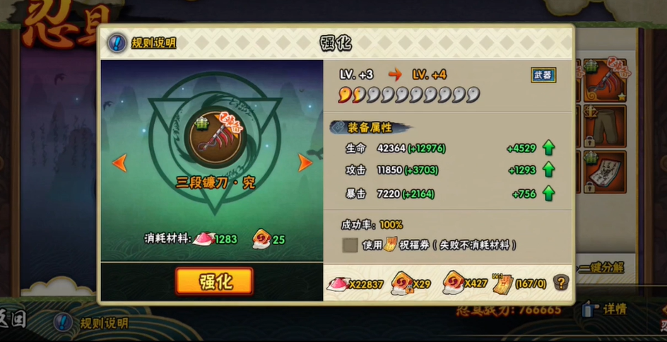 三段镰刀作为传说级究忍具,能够提供显著的战力加成。当武器部位的三段镰刀强化到15级时,可以带来大约36万点的战力提升,这个数值在忍具系统中属于顶尖水平。究忍具的基础战力本身就远高于普通橙色忍具,尤其是在武器和配饰这两个关键部位,强化带来的收益最为突出。配饰部位强化到12级时,也能增加约22万战力,这使得它成为玩家提升实力的重要选择。