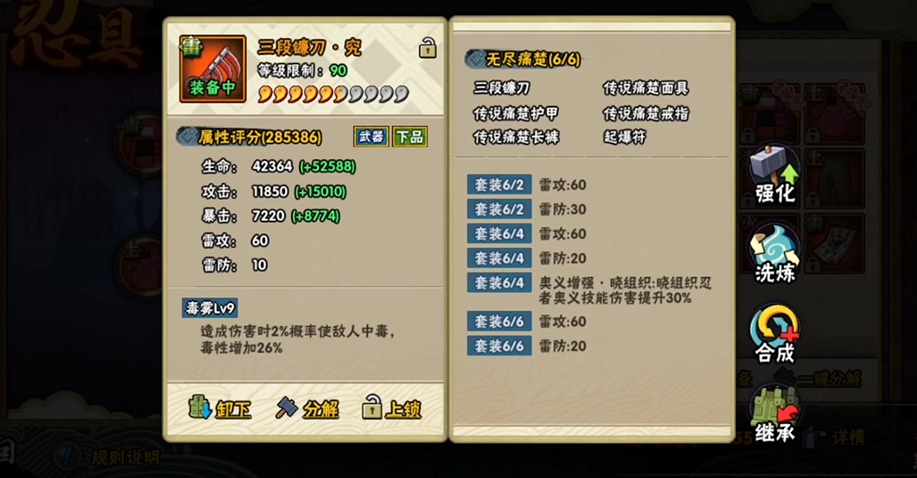 获取三段镰刀的主要途径包括参与90级团队副本,比如佩恩入侵的修罗难度,在十人组队挑战胜利后有一定概率直接掉落。除了副本获取,玩家还可以利用忍具合成系统,通过使用痛楚套装或魅影套装等特定材料进行定向合成,这也能增加获得究忍具的概率,不过合成消耗的资源较多。