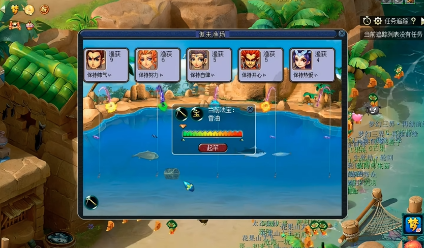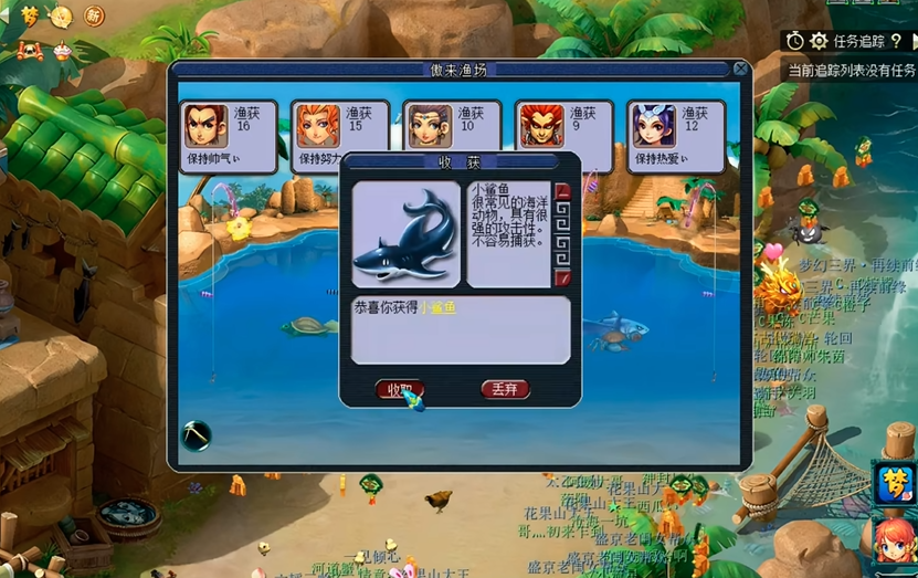 钓鱼的时候最好保持网络顺畅,不然鱼容易跑掉。你可以多观察水面和鱼漂的变化,不同的提示信息对应着不同的鱼种和拉杆方法。比如拉杆的力度、角度和速度都需要根据情况调整。积攒的鱼除了可以直接卖给鱼市收购商换钱,还能换成一种叫钓鱼积分的东西。这个积分用处可大了,能在捕鱼人那里兑换各种奖励,像用来修装备的珍珠、能在战斗中用的海马,甚至还有彩果这些好东西。