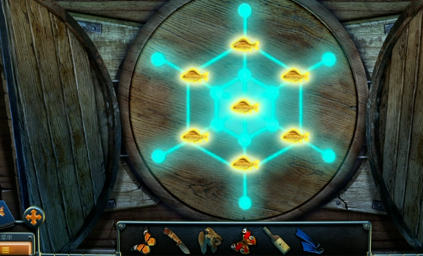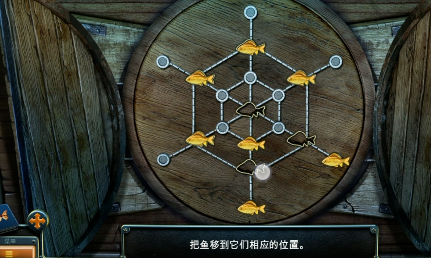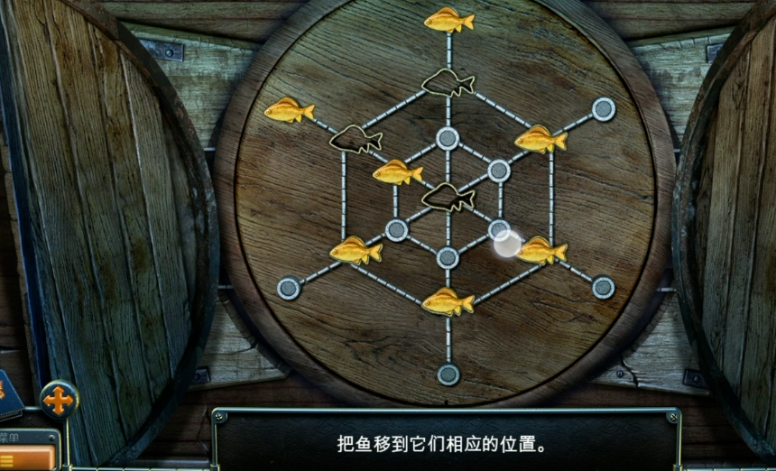 小鱼移动关卡是一个考验玩家逻辑思维的谜题环节,玩家需要将分布在圆形图案上的六条小鱼通过整体移动和旋转操作归位到对应位置,需要先集齐六条小鱼才能触发游戏,成功解锁后门会打开并允许进入下一个区域。玩家首先需要点击门上的机关进入游戏界面,界面中的小鱼排列在竖列、斜线以及内外圈等不同轨道上,移动时不能单独调整某条鱼,而是拖动整列或整圈来改变位置。