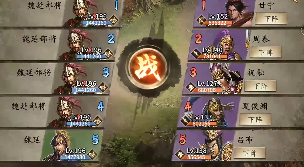 夏侯渊在这个阵容里扮演着控制角色,烛龙套装能封锁住敌方第三、第四将的战法。周泰则需要霸下套装和曹仁副将,战车护甲越高越好,确保每排兵都能有效杀伤敌人。最后收尾的关羽穿着灵龟套装,一定要把觉醒战法留到关键时刻,专门用来收拾残血的敌将。