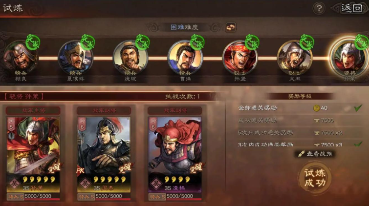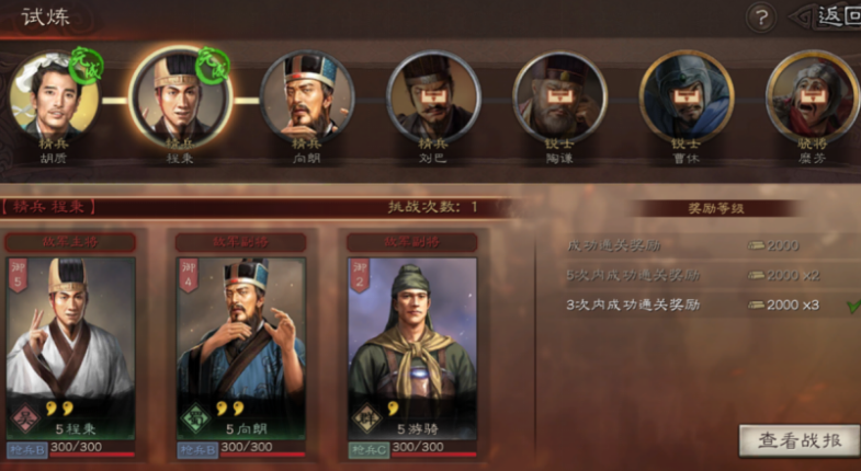 那这个试炼具体是个啥玩法呢,它就像个闯关小副本,你需要自己派三个武将组队进去打。 这里组队比较自由,不像外面大地图打仗还得考虑阵营加成和兵种配合,这里就只看你武将本身的强度和你搭配的战法好不好用。你的武将等级、带的技能、加的属性点,甚至装备效果,都会原封不动地带进去。 这样一来,你就能提前感受一下你手里那些武将搭配起来到底好不好使,算是个不错的练兵场。你可以随时换将,专挑克制对面阵容的武将上,用最小的代价去通关。