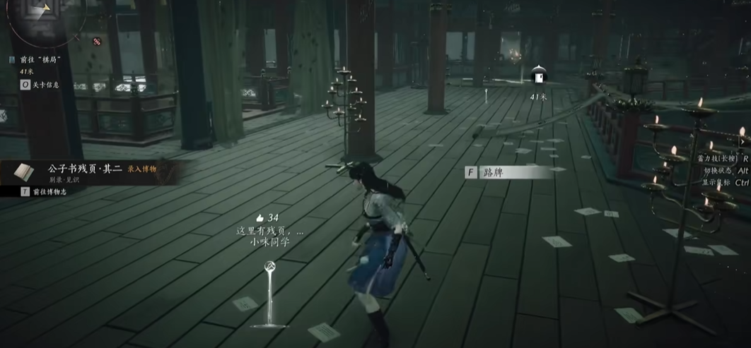 公子书残页的具体位置十分明确,全部集中于开封的樊楼内部。收集工作可以从一楼开始,在完成前置任务执子入局后,就能在楼下画卷的左右两侧分别找到第一和第二张残页。之后需要逐层探索,二楼楼梯口、棋局边以及画前地板上藏有第三至第五张。登上三楼,残页位于楼梯口附近、楼梯右手边的屋内以及墙上的画像顶端。最后两张残页则在四楼,分别位于图中位置的地面和一处屏风之前。收集时如果遗漏,可以通过任务界面的场景回溯功能重返场景,也可以利用游戏内的听风辩位能力来辅助寻找。