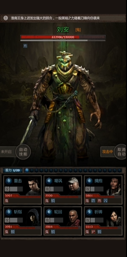 进入与刘安本体的战斗后,资源管理与技能释放时机至关重要,战斗前应尽可能积攒满豆子即技能释放资源。开场后,主力输出角色龙应尽可能频繁地使用斩指技能以快速削减刘安的生命值。治疗角色需时刻关注队伍血量,尤其在刘安释放折斩技能前,要确保队员特别是血量最低者的安全,因为折斩会优先攻击生命值最低的单位并附加流血效果。坦克角色胖子的嘲讽技能应看准时机释放,力求让刘安的折斩打在自身身上,以保护其他关键队友。另一种稳妥的思路是携带宁宁,利用其技能降低刘安的攻击力,为队伍争取更安全的输出环境。