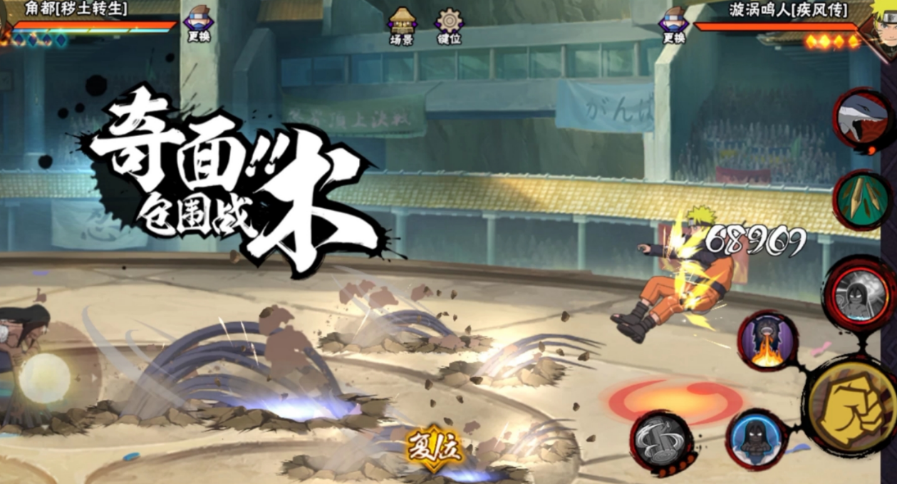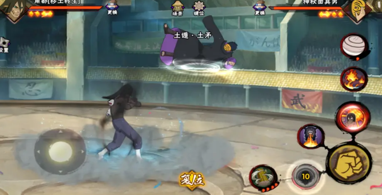 对抗角都需要特别注意其替身术的使用时机。角都的土矛防御具有短暂前摇,在预判其使用硬化时可以穿插抓取技破除霸体。面对角都的奥义技能,提前准备位移或无敌帧技能进行规避是关键,尤其当其集满四个面具怪时,奥义伤害达到峰值,必须通过快速横向移动或垂直起跳来躲避主要伤害区域。