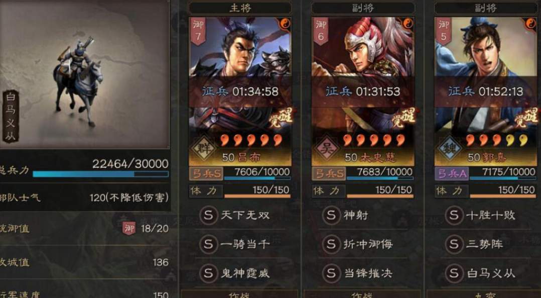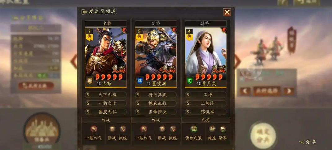 战法选择上,吕布必备一骑当千和百骑劫营,前者提供群体兵刃伤害,后者针对主将的额外攻击效果能快速压低敌方血线。鬼神霆威虽有高额伤害但稳定性较差,通常作为备选。郭嘉需携带三势阵和铁骑驱驰,若无后者可用当锋摧决替代。黄月英固定携带兵种战法(虎豹骑/西凉铁骑)及辅助战法如横戈跃马。加点方面,吕布优先全武力,若需内战抢速可适当分配速度属性,郭嘉和黄月英以统率和智力为主。