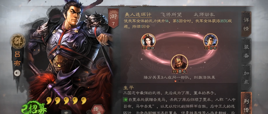 吕布核心玩法围绕三势阵体系展开,其爆发力和稳定性取决于战法、兵种及副将的搭配。三势阵能显著提升吕布自带战法天下无双的发动率,配合突击战法可在一至两回合内解决战斗。兵种首选虎豹骑或西凉铁骑,前者提高突击战法触发概率,后者增加暴击收益。副将郭嘉和黄月英是标准配置,郭嘉提供洞察保护,黄月英增强先手和输出加成,形成以吕布为单核的爆发体系。