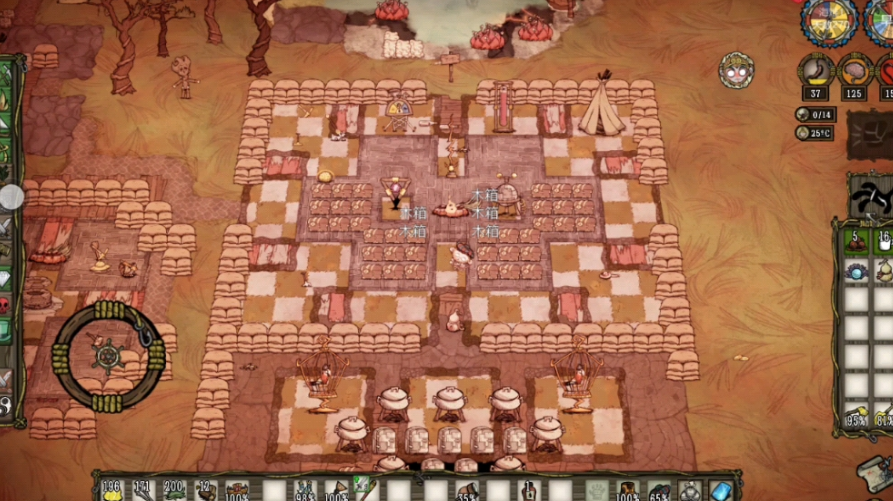 资源布局方面,基地需规划生活区、种植区与怪物建筑区。生活区中心放置二本科技、魔法二本及火堆,周边设置冰箱、鸟笼与晾肉架。种植区移植33个浆果丛、40组草和树枝,预留咖啡树与竹子空间,并配备灭火器防止自燃。怪物建筑区需利用石墙围住逗猴球,吸引猴子产出便便与小肉,但需注意猴群过度繁殖会掠夺资源。
