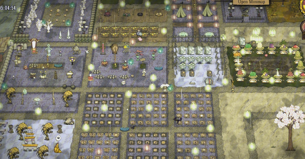 一开始可能就放个科技二本和几个箱子,但后期要加农场、晒肉架、鸟笼等设施,地方小了根本摆不开。最好选在开阔平整的地形,周围别太多树和石头挡着。灭火器的覆盖范围也要提前规划好,不然夏天一把火全烧光就尴尬了。