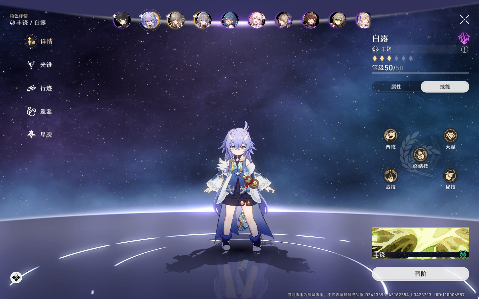 初始角色选择是游戏开荒阶段的关键决策,直接影响前期推图效率和资源分配。新手卡池(始发跃迁)包含7位五星角色,40抽保底机制下推荐优先获取布洛妮娅、白露或杰帕德。布洛妮娅作为风属性同谐角色,具备解控、拉条和增伤三位一体的辅助能力,其战技可清除负面状态并让队友立即行动,终结技则提供全队攻击力与暴击伤害加成,是泛用性极强的T0级辅助。白露作为当前版本唯一拥有复活机制的雷系丰饶角色,战技弹射治疗与终结技群体回复能显著提升队伍容错率,生息状态的受击回血特性尤其适合应对高爆发敌人。