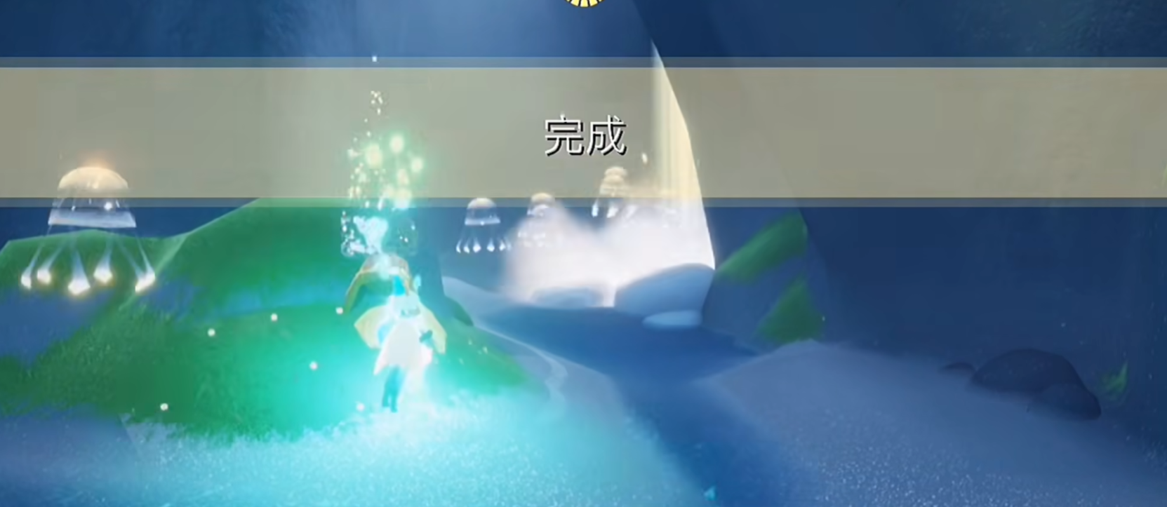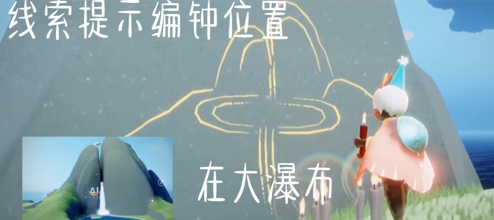 第一个任务通常从向导先祖处领取,动画会提示前往瀑布区域。玩家需点燃白色蜡烛触发壁画线索,随后进入瀑布后方洞穴即可找到编钟。第二个任务线索位于浮空岛,需在特定巨石旁点燃蜡烛,根据显示的藏宝图飞往中间带洞的浮岛获取编钟。第三个任务仍与瀑布相关,但需沿下游寻找发光水母群,跳入隐藏洞穴后在小瀑布旁发现编钟。