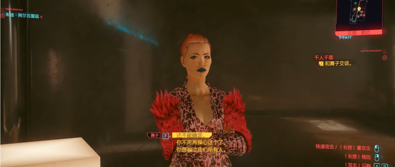 千人千面这个任务特别重要,见到舞子后一定要选择切断他们吧这个限时选项,接着选等等,我觉得有点过,最后拔出武器开战。打败虎爪帮老大后,面对舞子时最好选择杀死她,这样朱迪会特别开心。如果接受了舞子的计划或者收钱,那就前功尽弃了。任务完成后朱迪可能会有点情绪波动,这时候安慰她就对了。