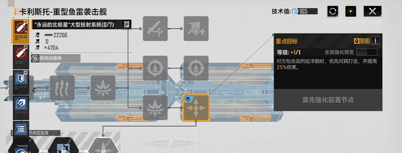 进入研究界面的技术研究区域后,针对目标舰船进行专项研究可提升其技术值。研究树系统会显示当前技术值进度,当航空母舰等大型舰船技术值累计达到200时即可获得金标标识。需不同舰种的技术值上限存在差异,需合理规划资源分配。