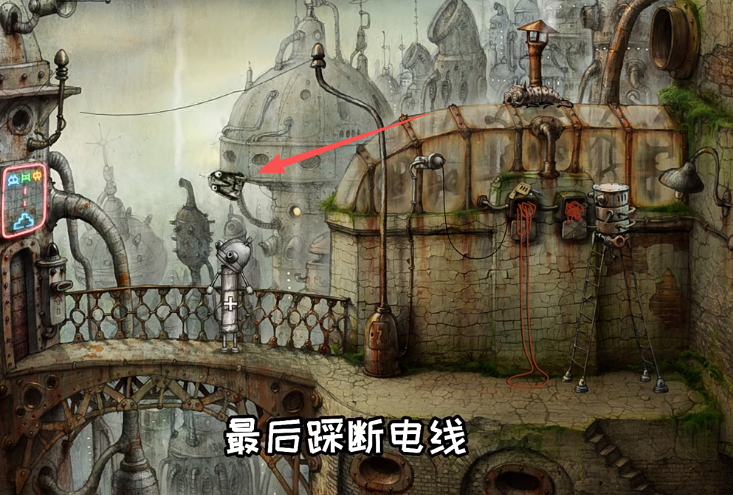 将鸟从路灯上弄下来是第八章乐队场景的关键解谜环节。玩家需操控机器人利用伸缩身体的能力与鸟进行互动,通过模仿动作使鸟失去平衡。具体操作为:走到路灯前的桥上,将机器人拉长再缩短,重复多次后鸟会模仿动作导致电线断裂。需注意节奏和时机,过快或过慢可能导致失败。