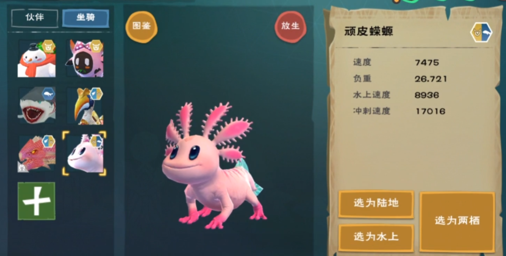 成功捕捉后,顽皮蝾螈可作为水陆两栖坐骑或战宠使用。小顽皮蝾螈的陆地速度在7000-7700之间,水上速度为8500-9200;大顽皮蝾螈的陆地速度为7700-8300,水上速度为8800-9500,负重能力略高于小蝾螈。其技能泡泡可攻击敌人并概率减速,泡泡盾则能持续回复主人体力与水分。若以战宠为目的,需关注其生命与攻击资质,大顽皮蝾螈的极品生命资质为4.3,攻击资质为1.4。
