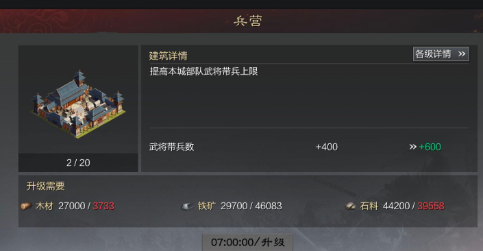 建造和升级兵营也是增加统兵数的好办法。兵营等级越高,每个武将能带的兵力就越多,每升一级能增加200带兵上限。记得优先把兵营放在资源充足的主城或分城里,这样升级起来更轻松。同时要注意平衡资源分配,别只顾着升兵营而忽略了其他重要建筑的发展。